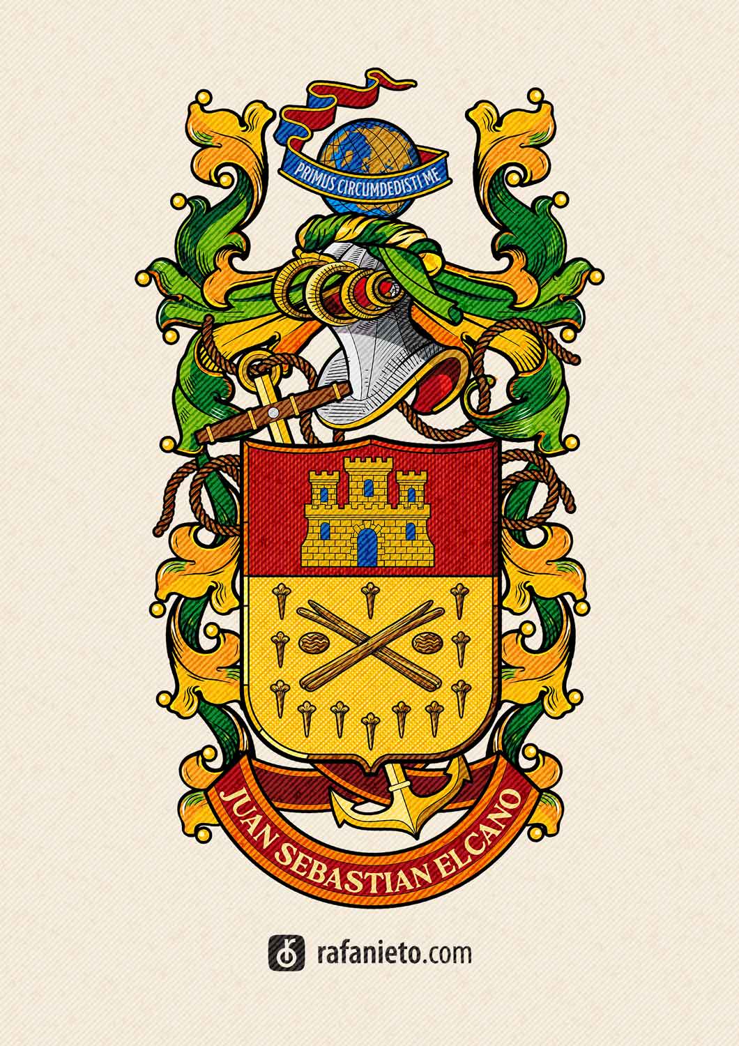 Escudo de armas concedido a Juan Sebastián Elcano por Carlos V tras la primera circunnavegación del mundo. Incluye el lema “Primus Circumdedisti Me” y símbolos náuticos. Ilustración heráldica original.