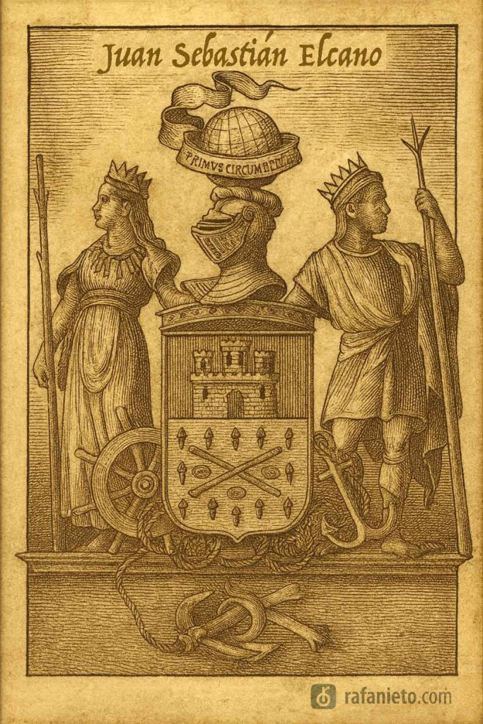 Allí me encontré con el escudo de armas concedido por Carlos I a Juan Sebastián Elcano, marino español, natural del este pueblo, y famoso por ser el primero en circunnavegar la Tierra (1519-1522).