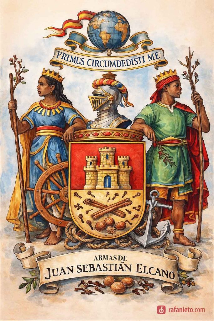 El blasón es un escudo partido: En jefe, un castillo de oro sobre campo de gules, y en la otra mitad un campo de oro, con dos ramas de canela cruzadas, tres nueces moscadas y doce clavos. Cimera: un globo terráqueo con el lema Primus circumdedisti me. Tenantes: dos reyes malayos, coronados, cada uno sosteniendo una rama de un árbol de especias, uno de canela y otro de clavo, al natural.